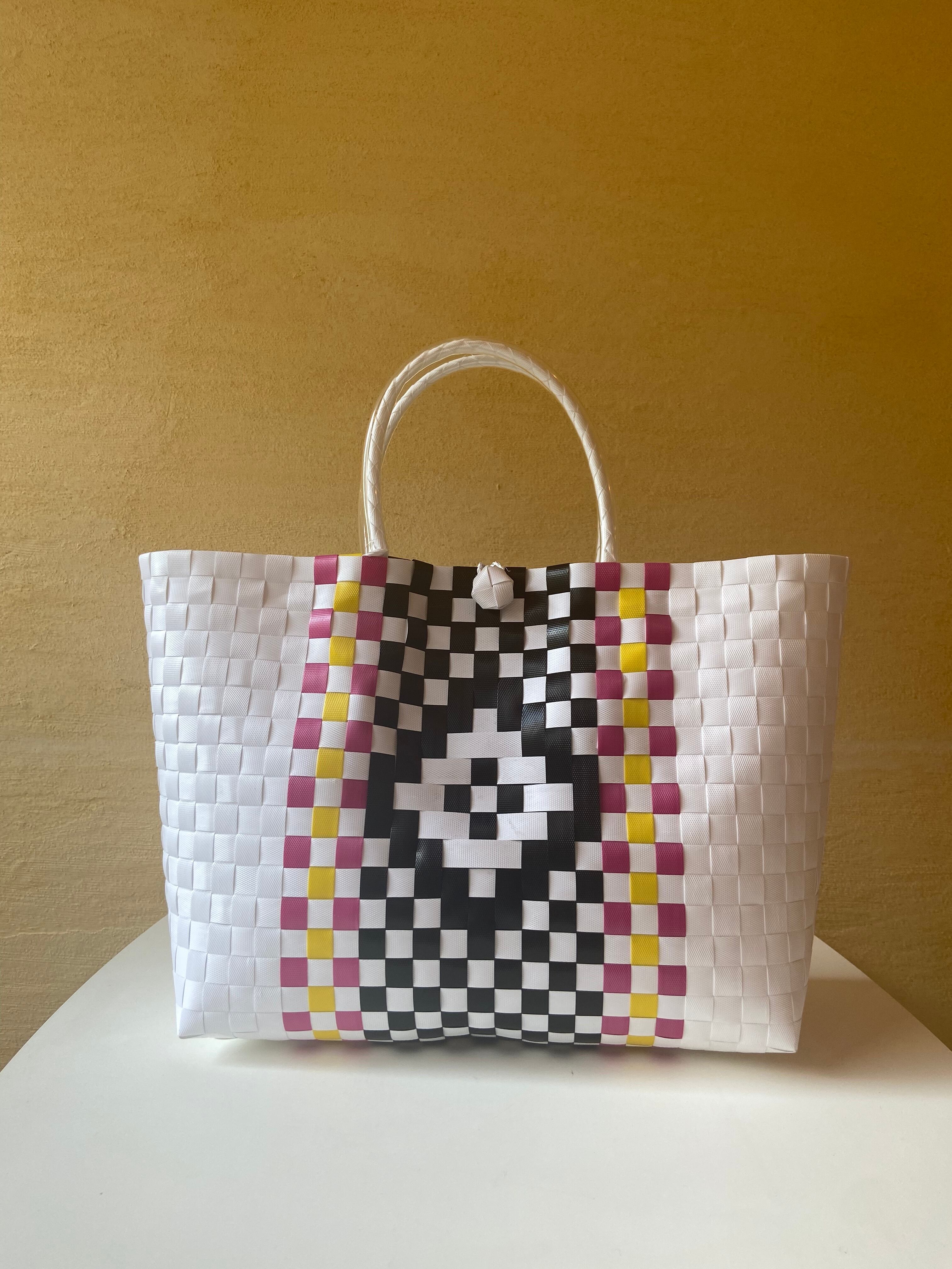 ポップな幾何学織りが人気のプラカゴバッグ。